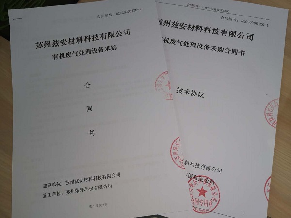 2020年4月20號,天氣晴朗,雖然疫情還沒有過去,但是絲毫沒有影響我們的工作熱情和進度。蘇州榮軒環保的小伙伴們一直兢兢業業,持續耕耘在自己工作崗位中。一份耕耘,一份收獲,蘇州榮軒環保和蘇州茲安材料有限公司簽訂了VOC廢氣處理項目合同。